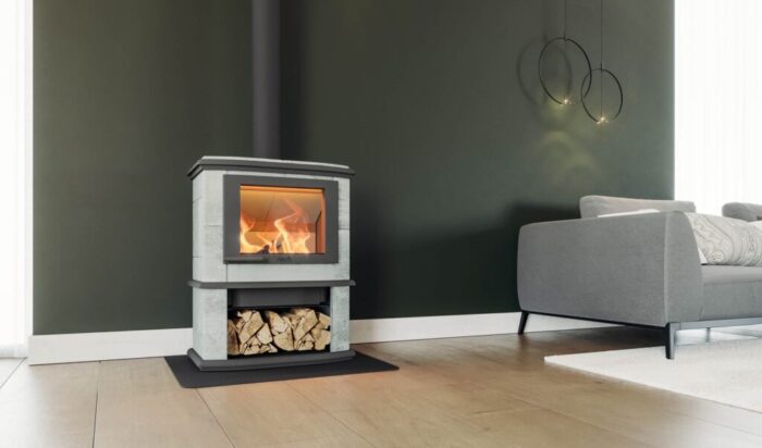 Dit compacte model is opgebouwd uit 5.5cm dik speksteen. Het speksteen houdt de warmte nog vele uren vast nadat het vuur gedoofd is. Voor het speksteen heeft u de keuze uit Naturel grijs of een uni-kleur, de kleur van het speksteen matcht met de kleur van het gietijzer.